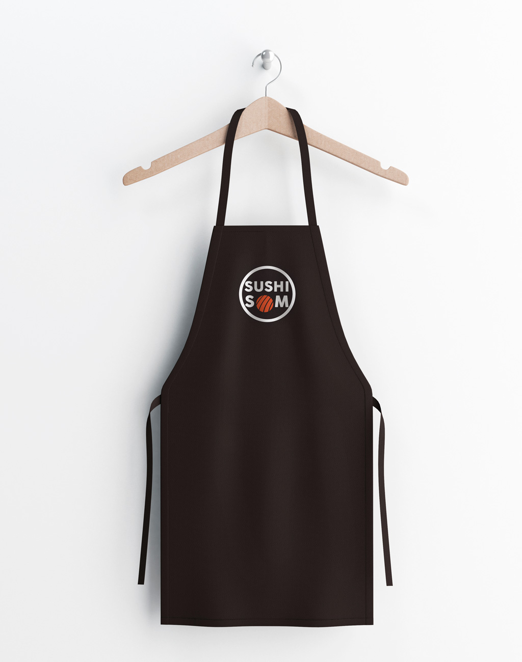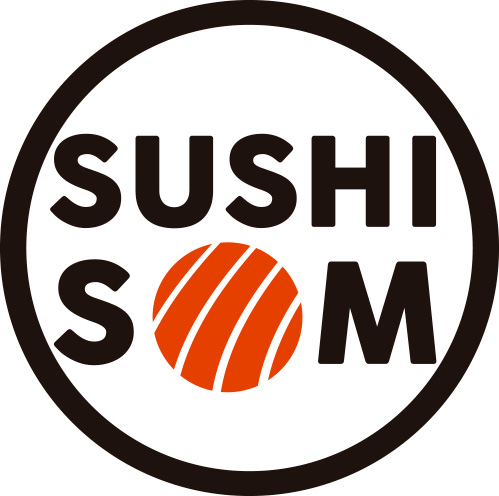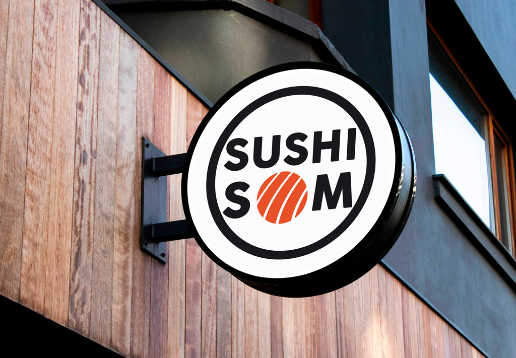 A modo de alga nori, una línea negra envuelve la marca y la letra O de la marca se convierte en un trozo de salmón.