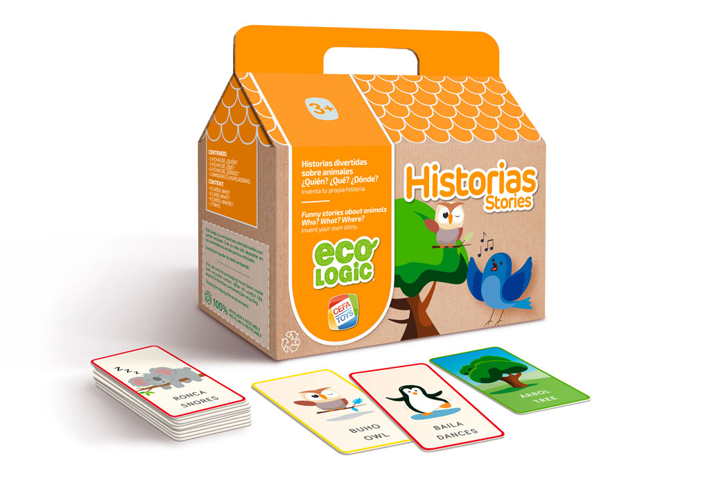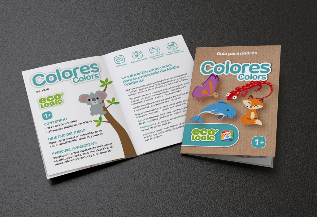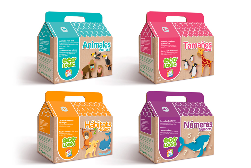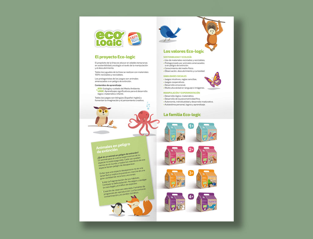 Asimismo, desarrollamos las ilustraciones de los animales en peligro de extinción que aparecen en las fichas de los juegos y en los propios envases y creamos el logotipo eco logic para esta línea de productos ecológicos 100% reciclados y reciclables.