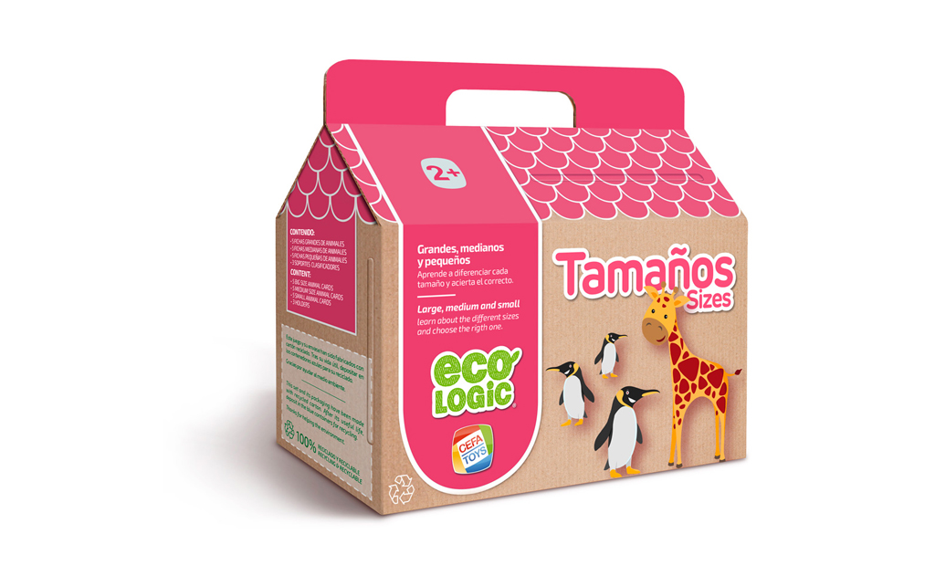 Para la línea de juguetes de primera infancia Eco logic ideamos ocho envases en forma de casita con asa para que los niños pudiesen transportarlos fácilmente y los considerasen como algo más que un simple contenedor del juego.