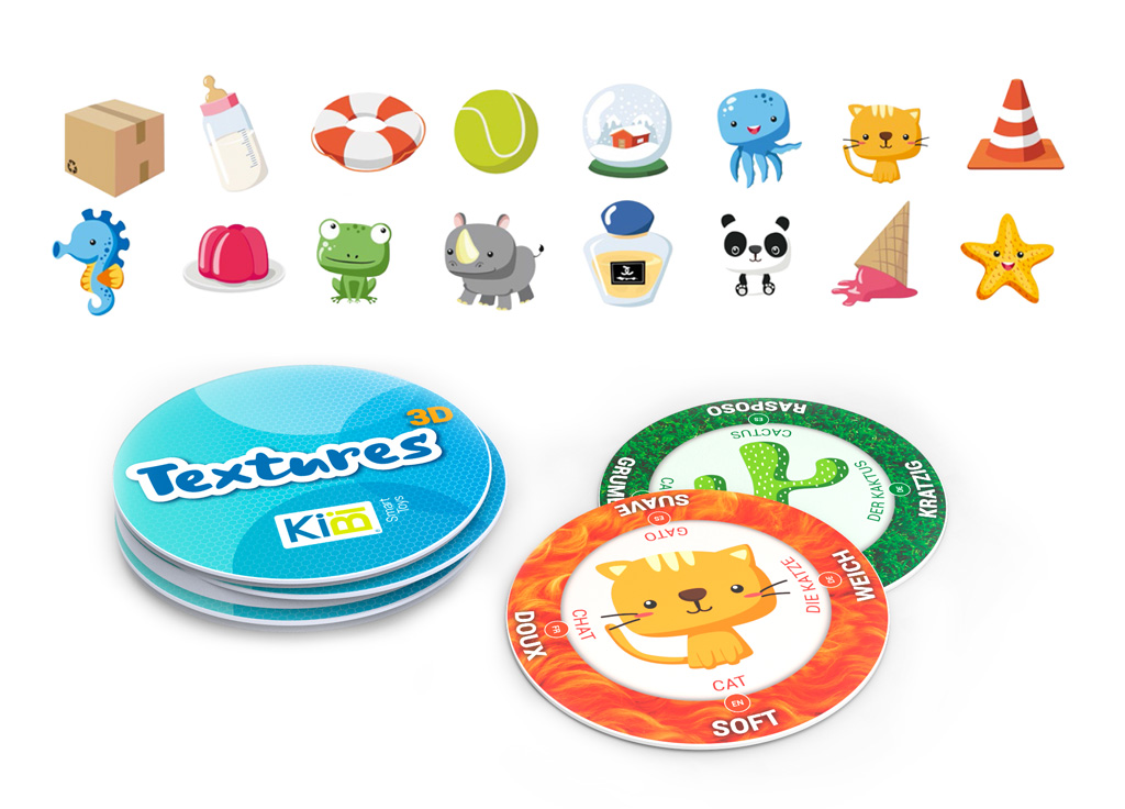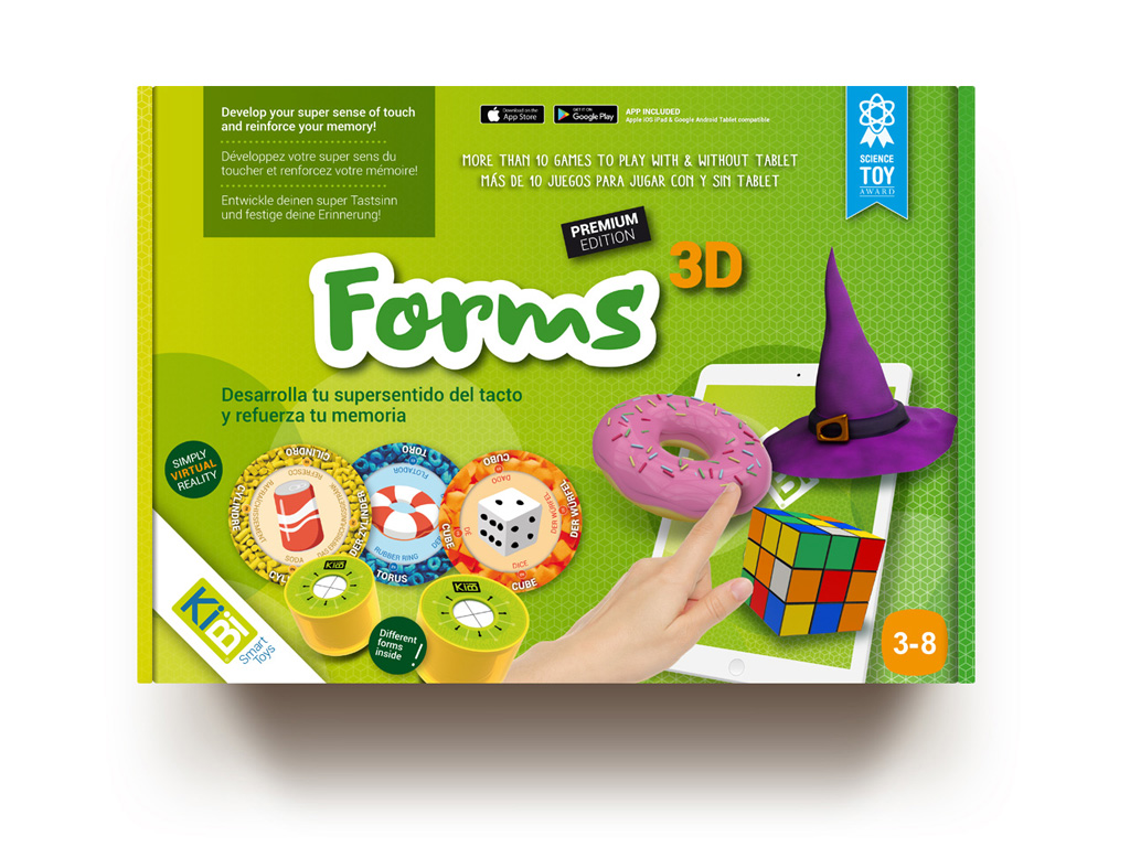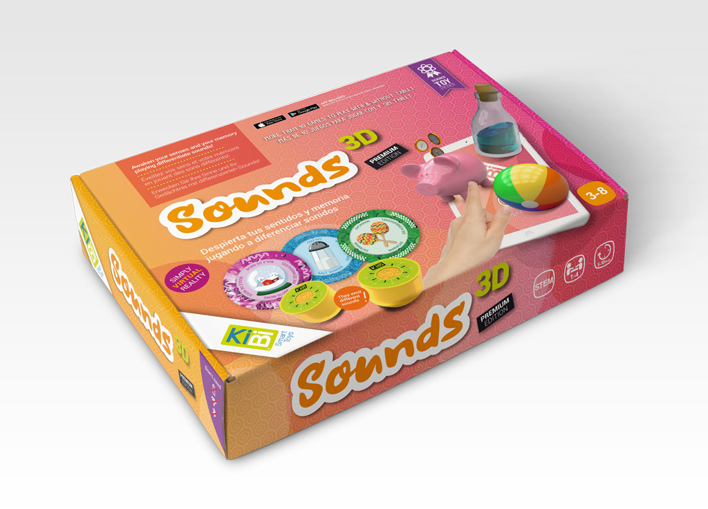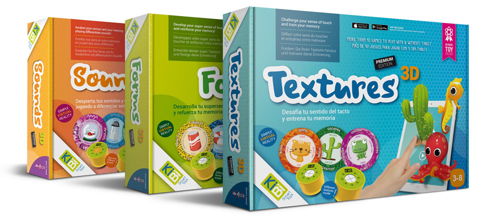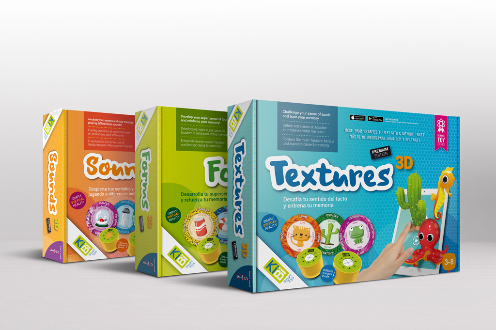El diseño de la línea de packaging de los juegos Sensory 3D se centra en la experiencia de uso mediante figuras 3D, basadas en las que muestra el propio juego a través de realidad aumentada con ayuda de una tablet.